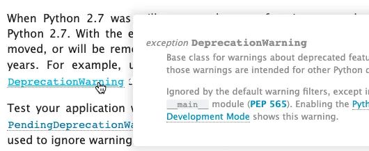Holscher’s presentation was an advertisement for nifty additions to ReadTheDocs, and an enticement to move CPython’s documentation there. ReadTheDocs recently added the hoverxref feature; when a reader hovers their cursor over a link in a documentation page, a tooltip shows the content of the linked section. Holscher has forked the CPython docs to host them on ReadTheDocs and demonstrate this feature’s utility.