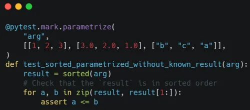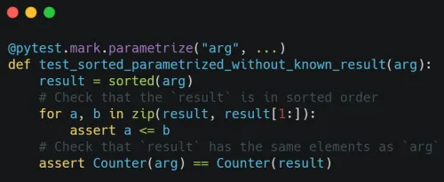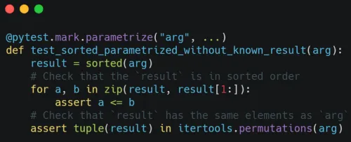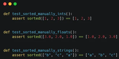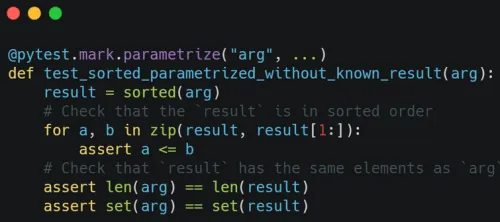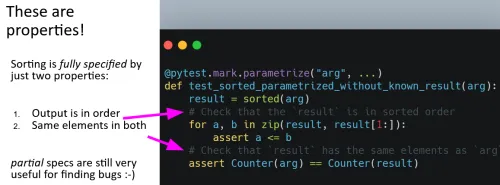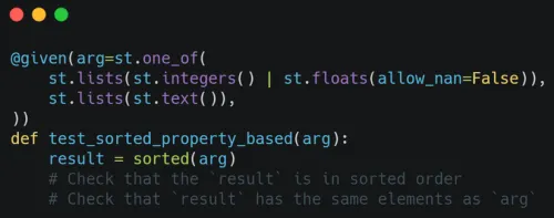 Imagine that you needed to test the sorted() builtin. With a traditional set of unit tests, you can write a bunch of cases with the expected inputs and outputs: